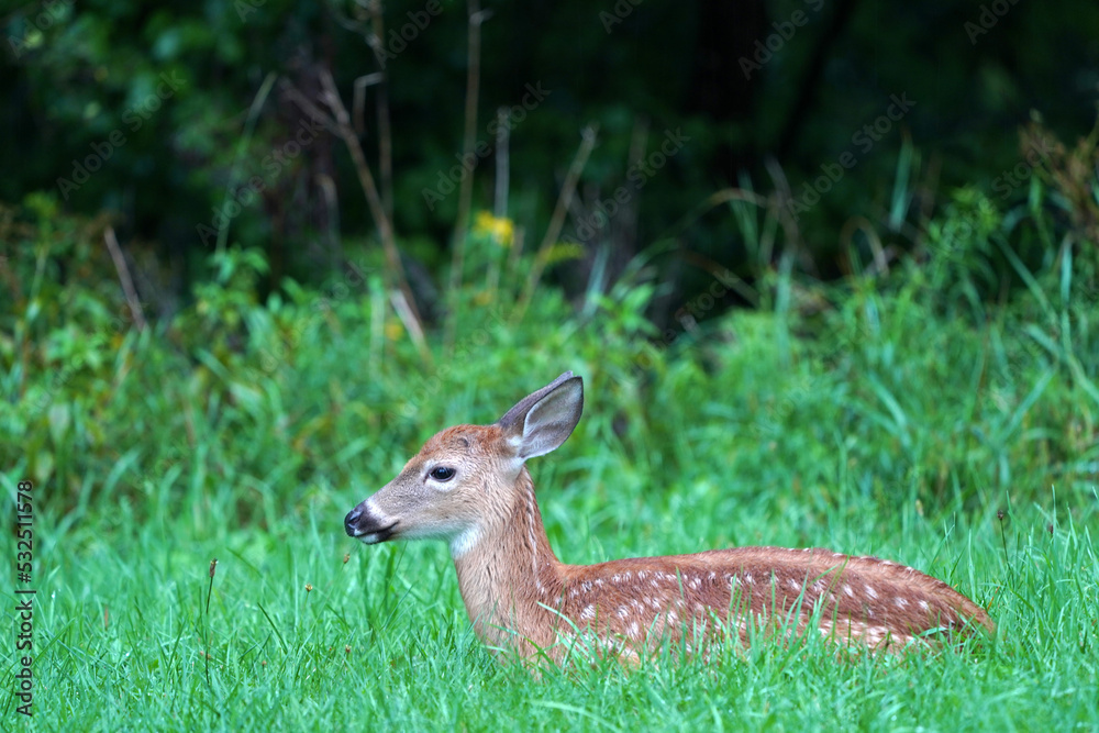 newborn baby white tail deer under the rain near the houses in new york state county countryside