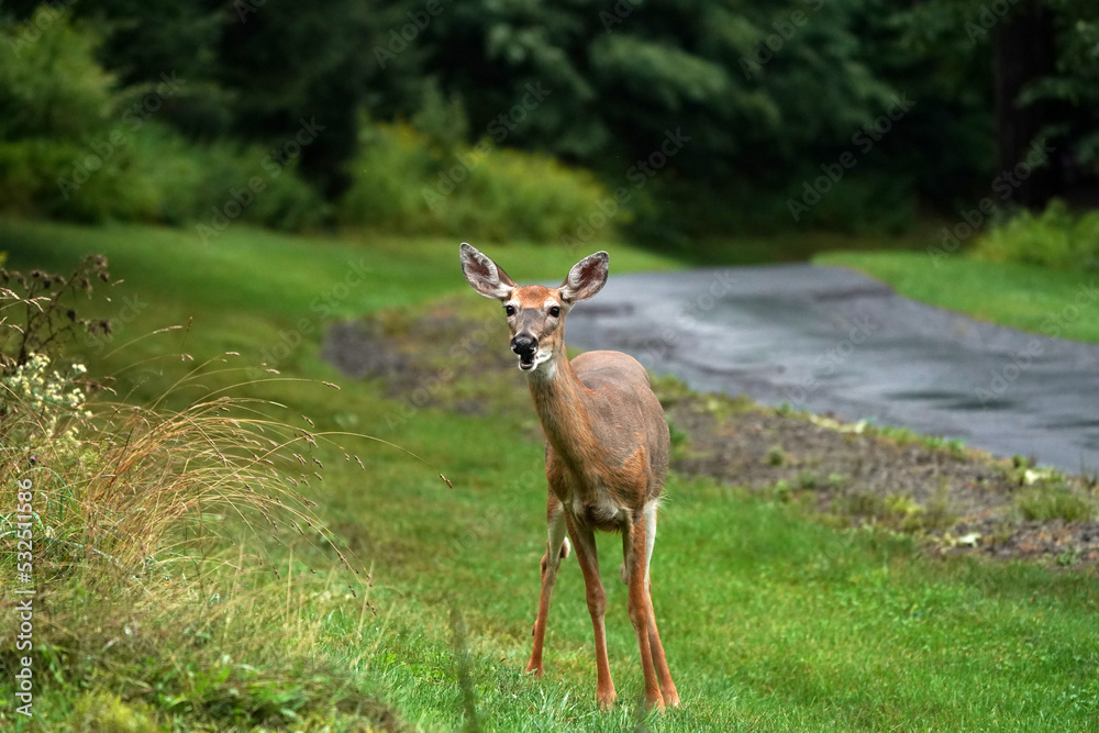 white tail deers on the road near the houses in new york state county countryside