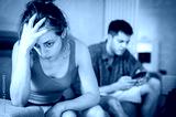 A young sad woman is next to her partner who is texting on the phone with someone, and not paying attention to her.