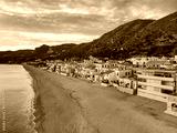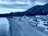 Aerial view of the beach of Varigotti during blue hour. Liguria, Italy