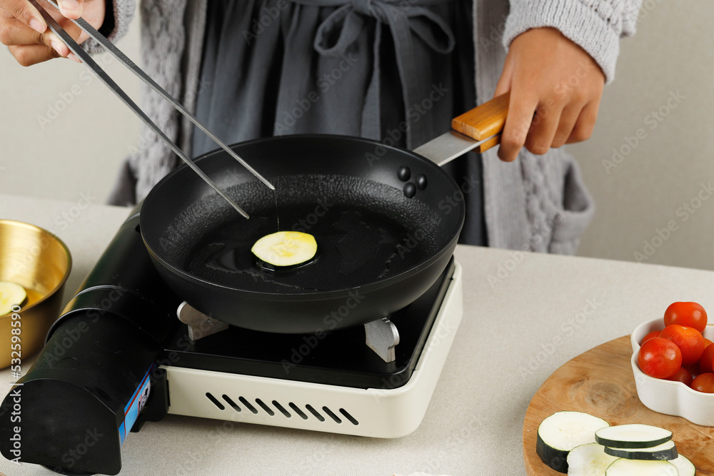 Cooking Hobak jeon, Korean Zucchini Pancake in the Kitchen, Put Sliced Zucchini with Egg Batter on Black Pan