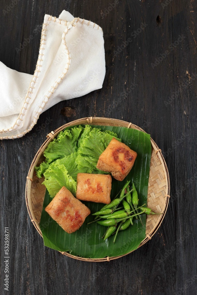 Top View Tahu Bacem, Sweet and Savory Stewed Tofu with Sweeet Soy Sauce. Served with Green Chilli