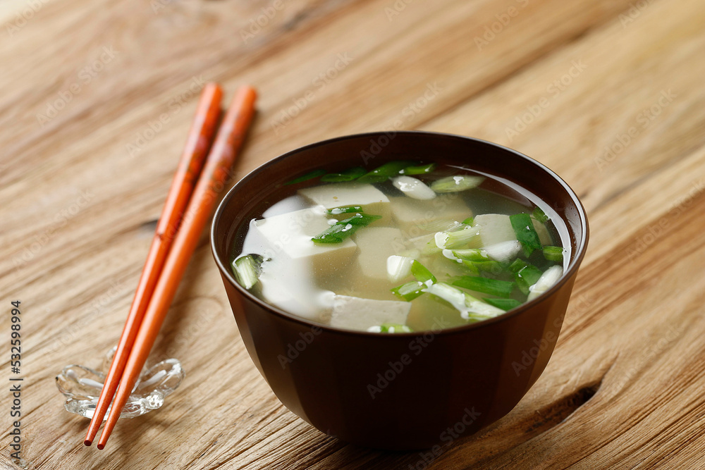 Japanese Miso Soup with Spring Onion and Cubed Tofu In a Brown Bowl, Wooden Table.