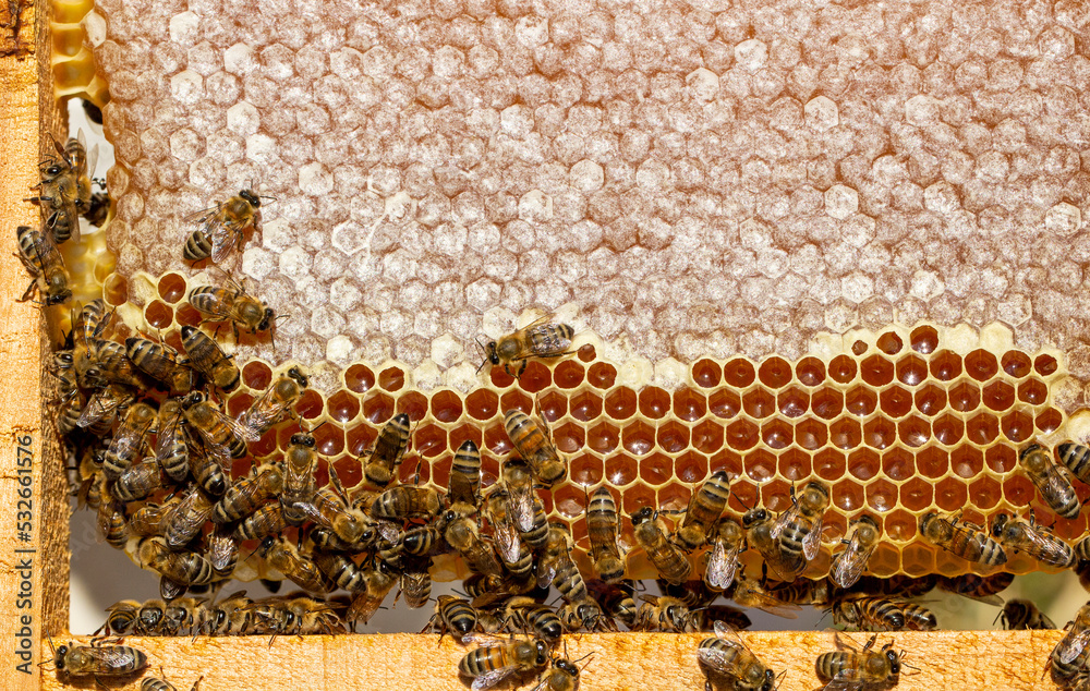 Beekeeping, freshly hatched honeycombs with bees from the beehive. Honey and bees.