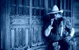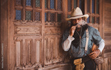 Portrait cowboy wearing western suite smoke cigarette is western cowboy style 1800s in vintage cowboys village background.