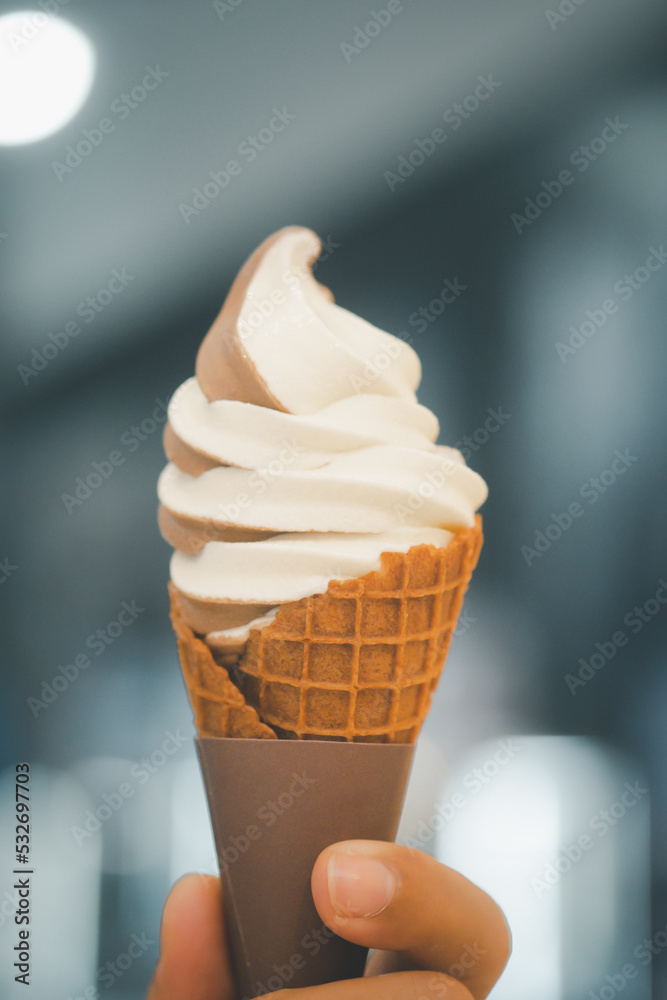 Two-tone soft serve ice cream cone in hand, close up