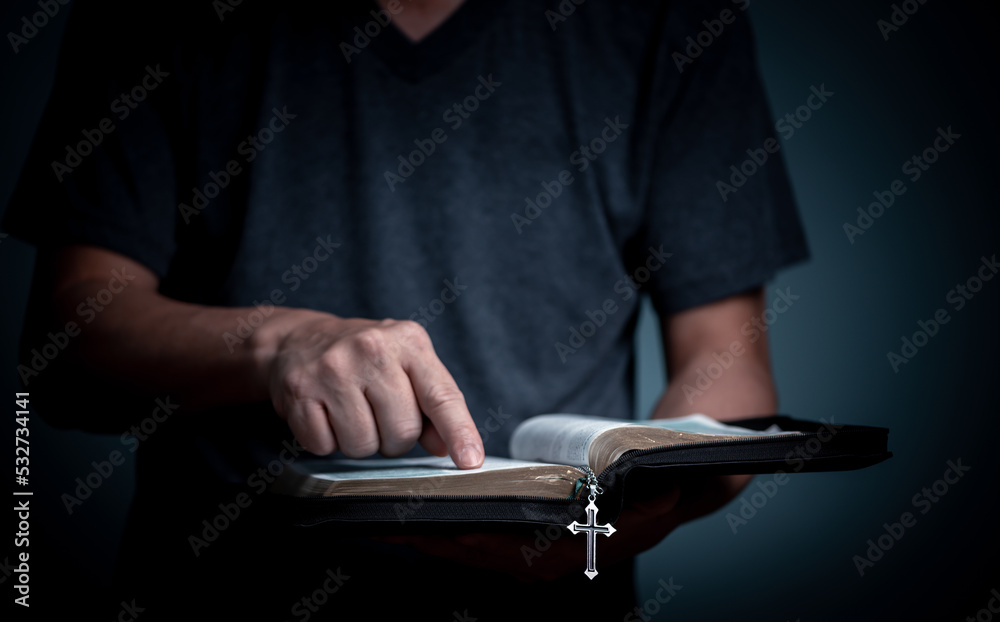 Young man reading Holy Bible and pointing on the word with cross necklace in font of the book.