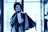 Happy black woman with shopping bags using mobile phone while standing in front of store.