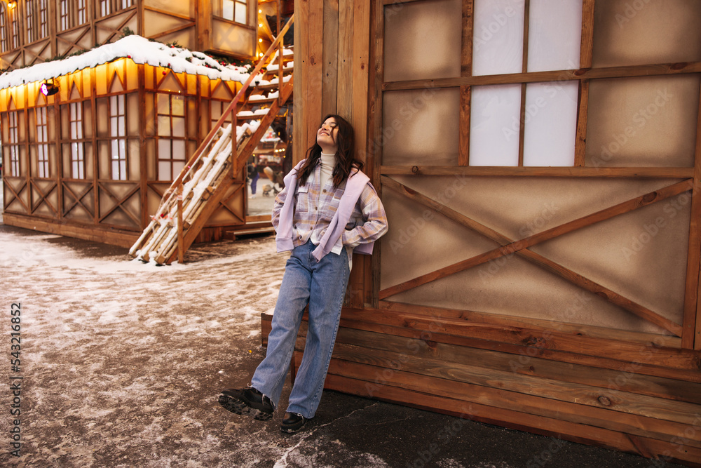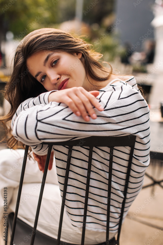 Beautiful european young lady posing looking at camera sitting on chair in outdoor cafe. Brunette wears casual clothes spring. Lifestyle concept
