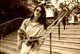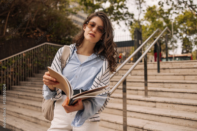 Attentive european young lady stands with notebooks near city park in spring and looks at camera. Brunette wears casual clothes. Lifestyle concept