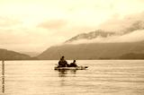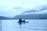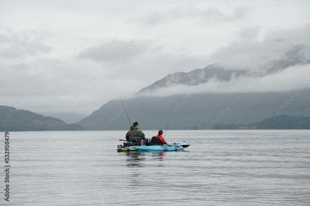 Fishing from kayak on calm water surrounded by mountain scenery Scotland
