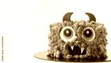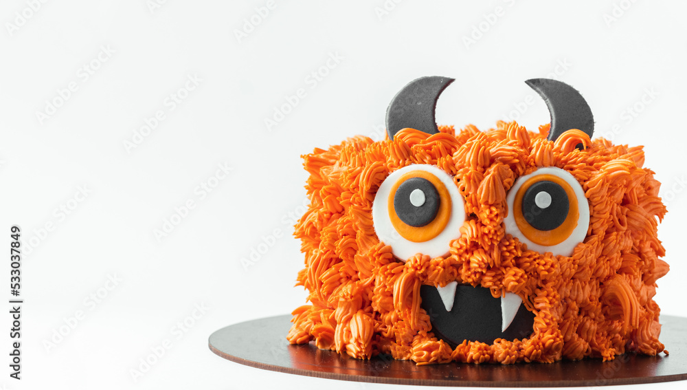 Monster theme cake on the white background. Halloween cake with orange fluffy cream cheese frosting isolated on white