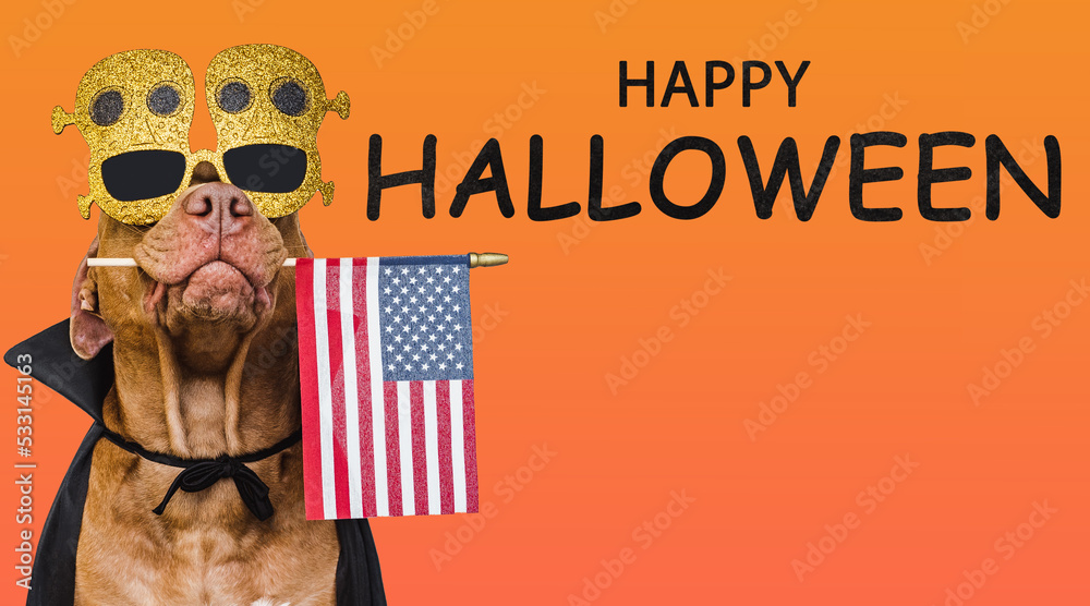 Charming, lovable brown dog holding American flag