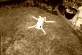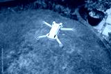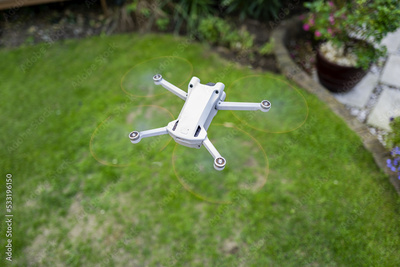 Shallow focus of a low flying drone machine showing its fast spinning rooters and object avoidance sensor