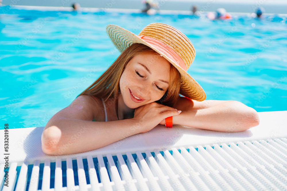 portrait of a calm woman with eyes closed in a straw hat at the side of the pool