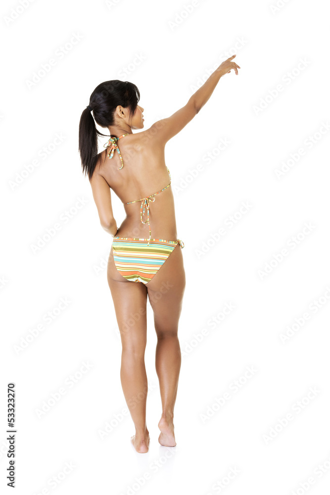 Tanned summer woman pointing on copy space.