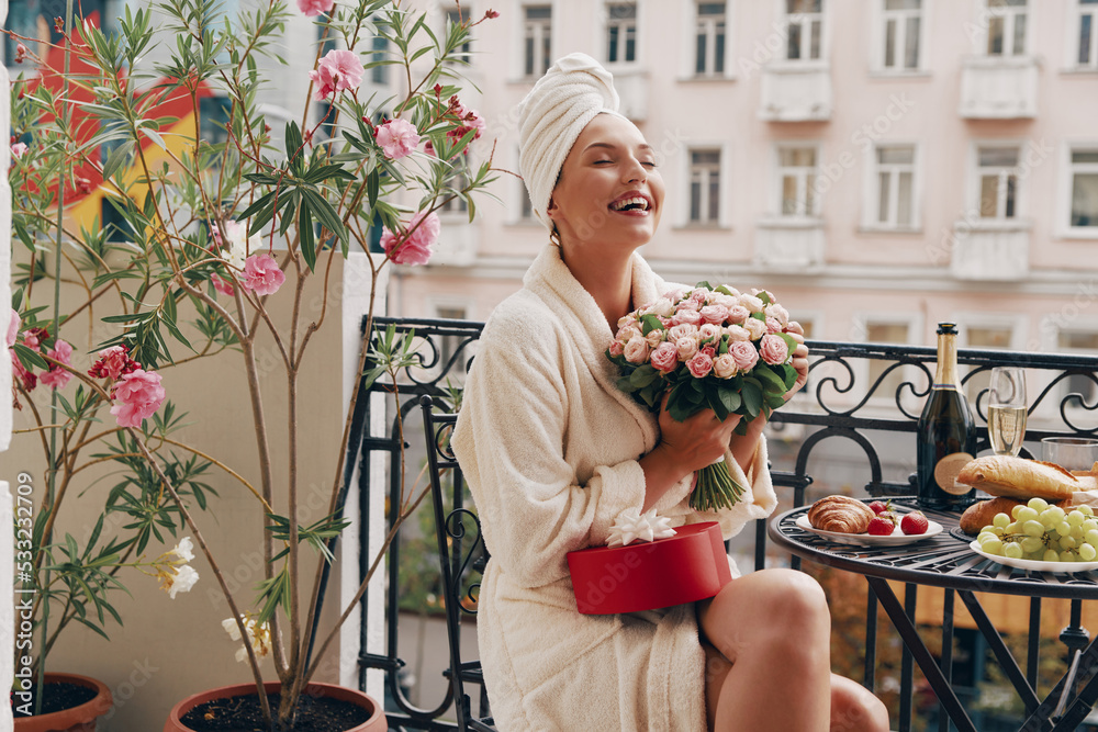 Excited woman in bathrobe holding a bunch of flowers and gift box while having brunch on the balcony