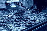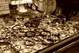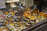 Colorful showcases of traditional jewelry stores and amber gemstone products in city market square in Gdansk Poland Mariacka street. Souvenir jewelry for sale as gift. Variety assortment of souvenirs