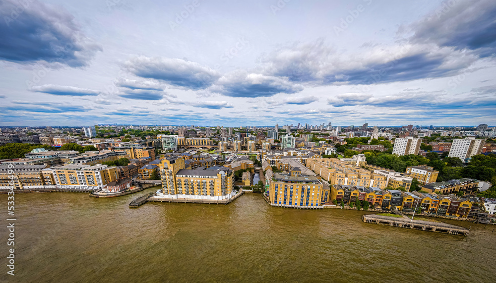 Aerial view of the Limehouse, a regenerated former dockland area at the River Thames in London