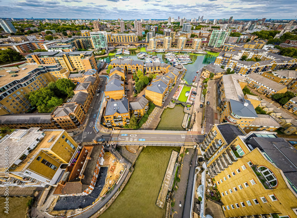 Aerial view of the Limehouse, a regenerated former dockland area at the River Thames in London