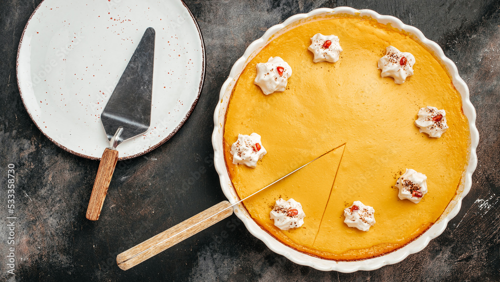 Homemade pastry pumpkin cheesecake, Pumpkin Pie with whipped cream for Thanksgiving Day. banner, menu, recipe place for text, top view