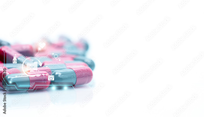 Capsules pills with medical and healthcare icons. Hospital care and health insurance service. Pharmaceutical technology. Pharmaceutical care. Inpatient and outpatient medication costs. Telepharmacy.