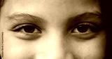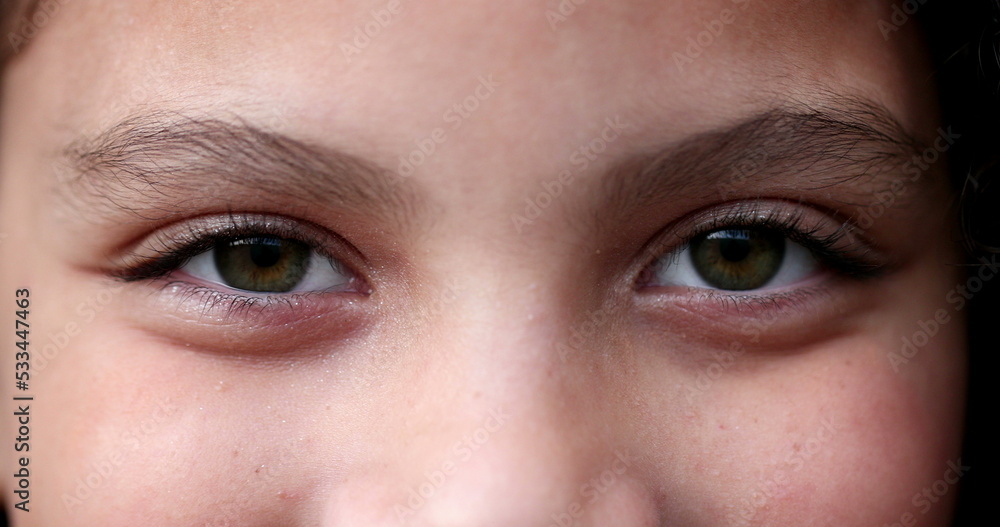 Child closing and opening eyes and smiling, macro green eyes close-up