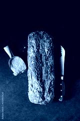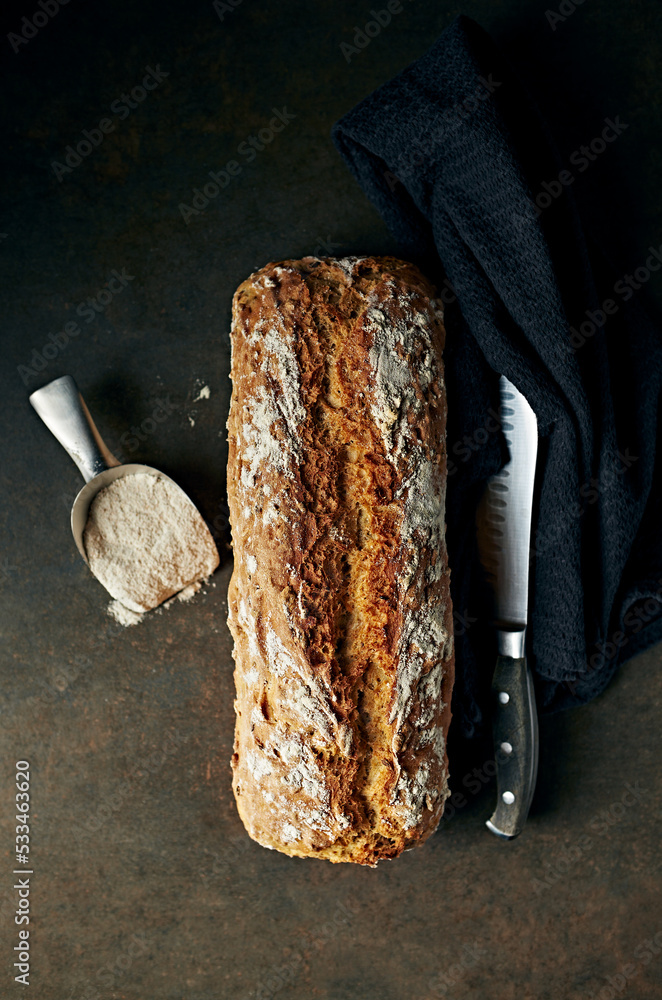 Rustic homemade spelt and wheat flour bread. Healthy food concept. Copy space. Top view