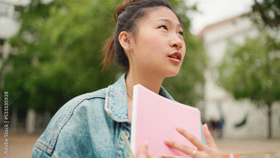 Attractive Asian student learning by heart lecture preparing for exams. Young Japanese woman studying outdoors