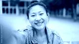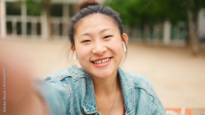 Pretty Asian girl smiling recording content for video blog enjoying good day on the street. Young Japanese woman looking happy walking outdoors