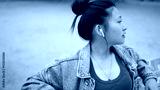 Side view of carefree Asian woman dressed casual listening music using wireless earphones for it on the bench