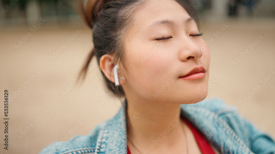 Close up attractive Asian woman closing eyes listening her favorite music in wireless earphones on bench in park