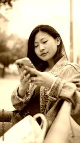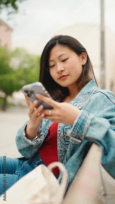 Beautiful long haired Asian girl dressed casual sitting on the bench and texting with friends using smartphone on street