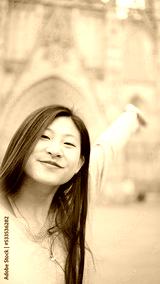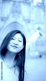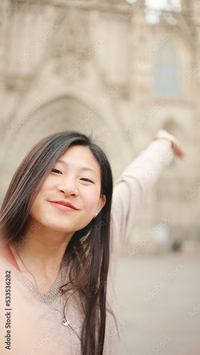Pretty Asian girl smiling while taking selfie against the backdrop of old architecture. Pretty Japanese woman posing outdoors
