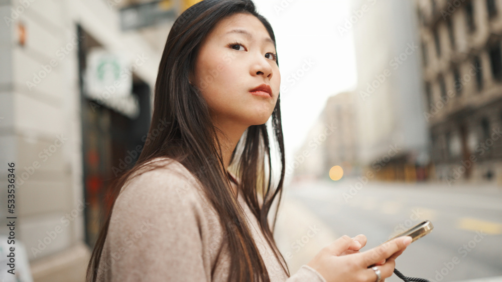 Side view shot of Asian woman looking concentrated holding smartphone walking across the crosswalk. Outdoors portrait of Japanese girl