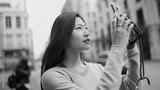 Beautiful Asian woman looking inspired taking photos of beautiful architecture using smartphone for it. Female Asian tourist exploring European city