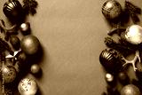 Green Christmas background with balls, decorations, fir branches. Christmas holiday celebration, winter, New Year concept. Christmas banner mockup, greeting card template. Vintage, retro style.