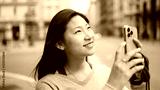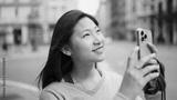 Portrait of pretty long haired Asian woman taking photos of old architecture looking happy while using smartphone on the street