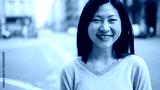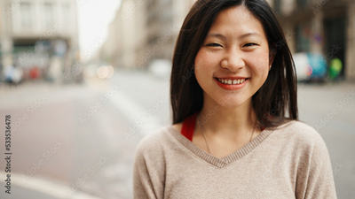 Portrait of Asian woman looking at camera smiling standing on the street. Happy emotions. City life concept