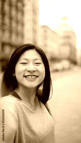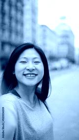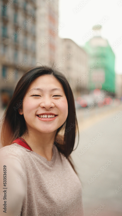 Asian female blogger looking cheerful smiling while walking down the street. Happy woman making content for her blog in city