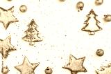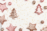 Christmas holiday pink beige decorations trend sparkling xmas toys from metallic sequins, shining Christmas trees, stars, balls and golden stars New Year background, Happy holidays concept
