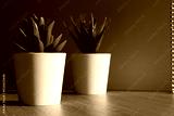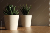 small potted fake plants on wooden table and dark background