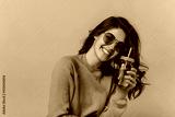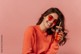 Happy young brunette caucasian woman is looking at camera against pink background. Hottie wearing glasses and sweatshirt holding can of drink. People's emotions, lifestyle and fashion concept.