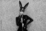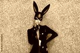 Sexy blonde woman posing in Halloween vinyl black costume and black bunny mask on on a glitter gold background. Halloween costume.