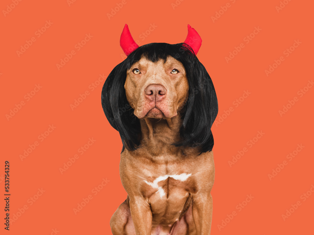 Charming, lovable brown dog and devil horns. Bright background. Close-up, indoors. Studio shot. Congratulations for family, relatives, loved ones, friends and colleagues. Pet care concept