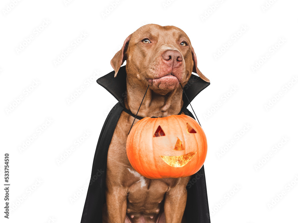 Charming brown puppy and ripe, juicy pumpkin. Close-up, indoors. Studio shot. Congratulations for family, relatives, loved ones, friends and colleagues. Pet care concept