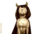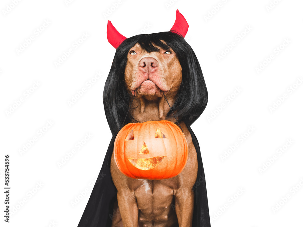 Charming, lovable brown dog, fancy dress and devil horns. Bright background. Close-up, indoors. Studio shot. Congratulations for family, relatives, loved ones, friends and colleagues. Pet care concept