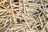 Pile of half-finished bamboo flutes, handmade bamboo flute production process by craftsmen, bamboo flutes being dried before finishing and marketed