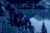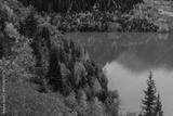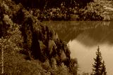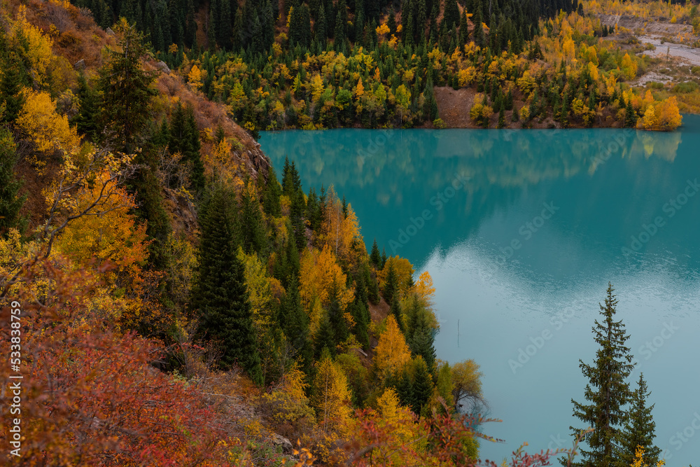 Trees on the shore of a picturesque mountain lake on an autumn day