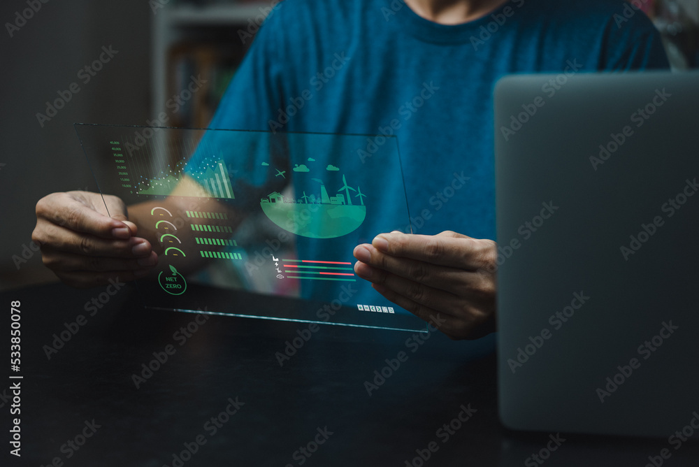 Businessman touching screen virtual icon eco energy sustainable environment digital technology concept.